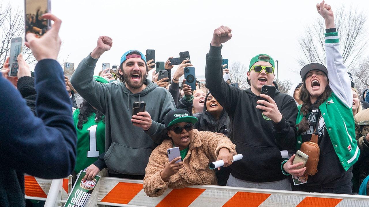 Fans of the Eagles of Philadelphia sing the Eagles before seeing the Saquon Barkley ball carrier outside the breeding fingers from Cane in Bensalem, Pennsylvania, Thursday, February 13, 2025. (Imagn)