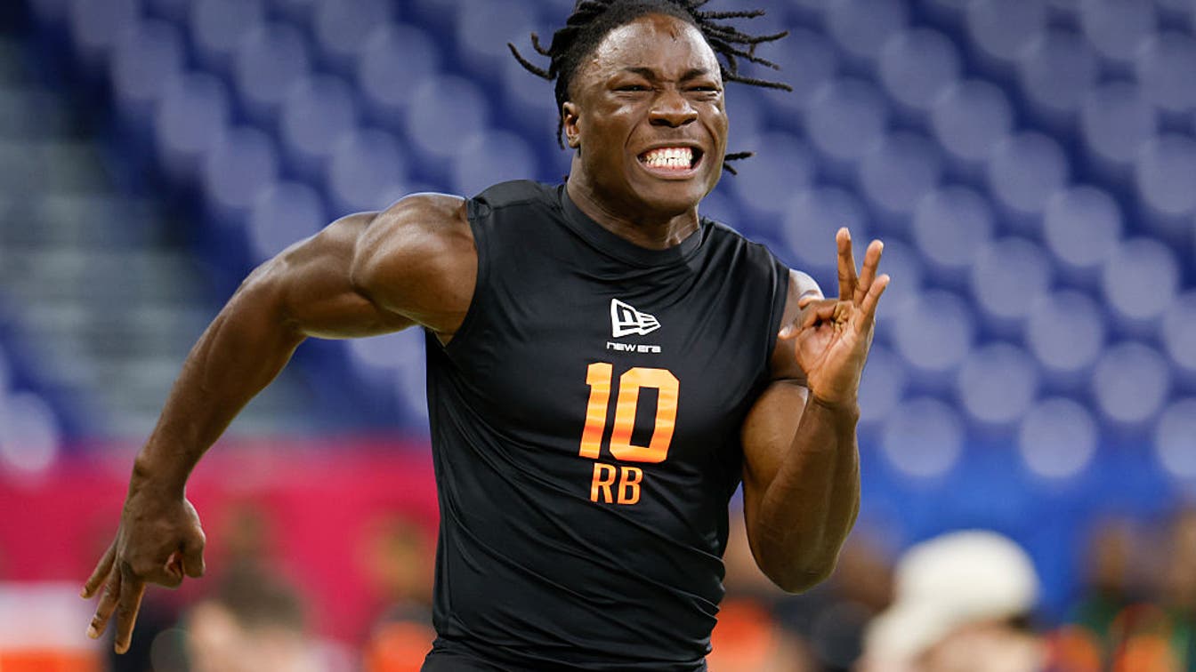 Emmett Johnson had the fourth-highest production rating of all running backs at the 2026 NFL Combine. (Photo by Lauren Leigh Bacho/Getty Images)