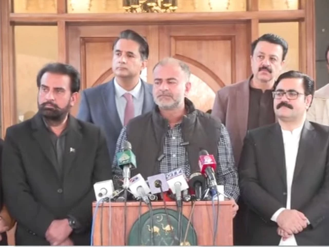 Balochistan Government Spokesperson Shahid Rind, accompanied by provincial officials, briefs the media on security operations and government response to recent militant activities in Balochistan. PHOTO: PTV (Screenshot)