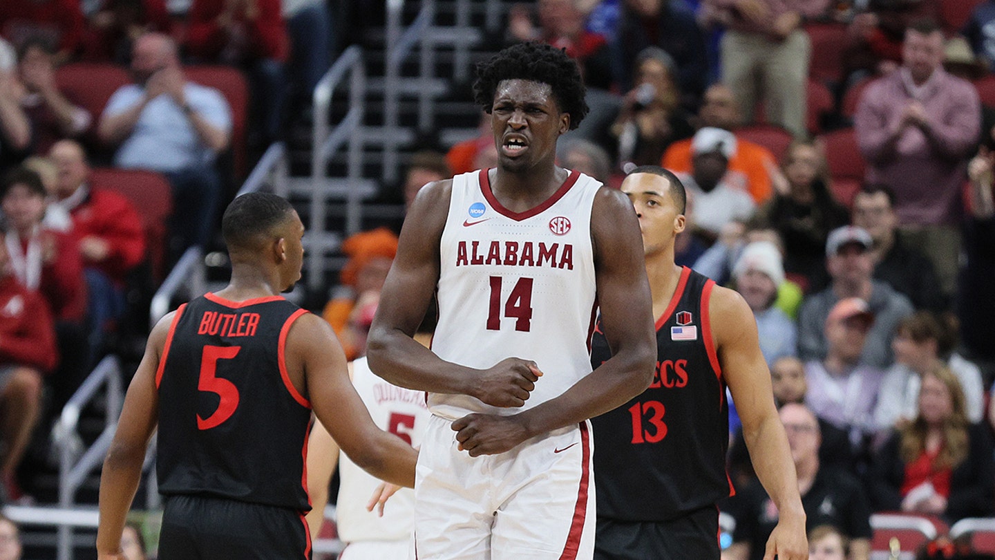 Charles Bediako of the Alabama Crimson Tide reacts during the second half in the Sweet 16 round of the NCAA men’s basketball tournament at KFC YUM! Center against the San Diego State Aztecs on March 24, 2023 in Louisville, Kentucky. (Andy Lyons/Getty Images)