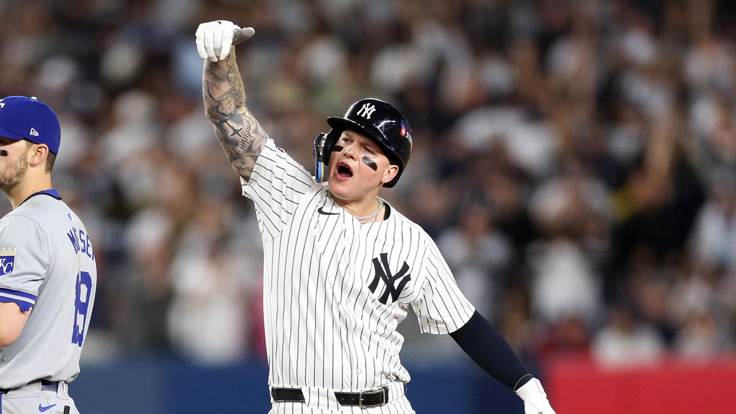 Alex Verdugo, n ° 24 of the New York Yankees, famous after hitting a single RBI against the Kansas City Royals in the seventh round in the first match in the Division series at the Yankee Stadium on October 5, 2024 in New York. (Elsa / Getty Images)