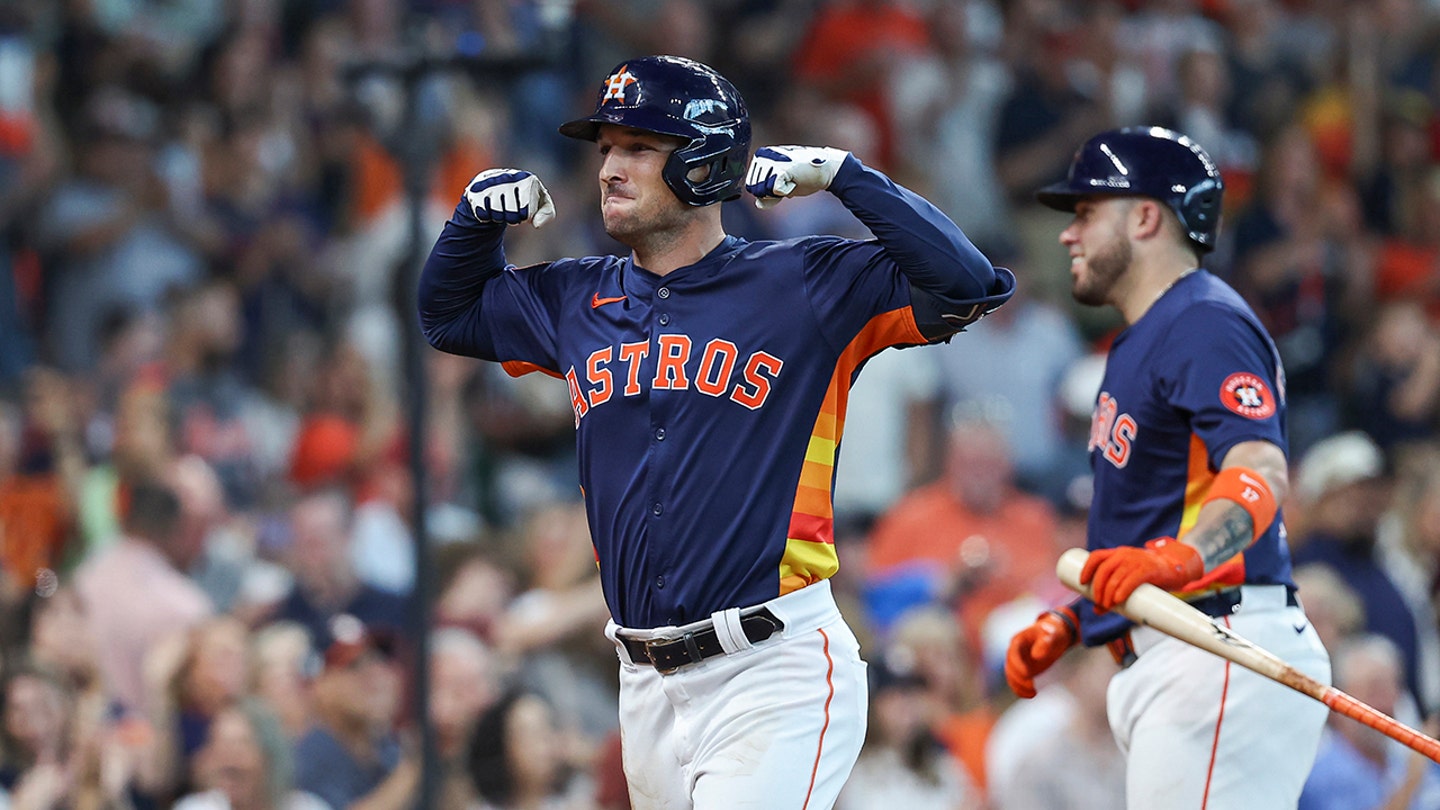 Alex Bregman, n ° 2 of the Houston Astros, beckoned to the fans before playing the Detroit Tigers during the Wild Card series at Minute Maid Park on October 1, 2024 in Houston. (Alex Slitz / Getty Images)