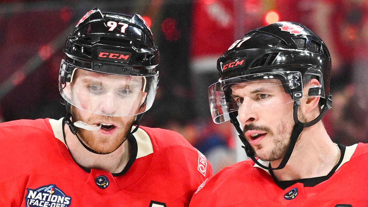 Canada Connor McDavid, # 97, and Sidney Crosby, # 87, speak during the third period of a 4-nations hockey match against the United States in Montreal on Saturday, February 15, 2025. (Graham Hughes // Canadian Press via AP)