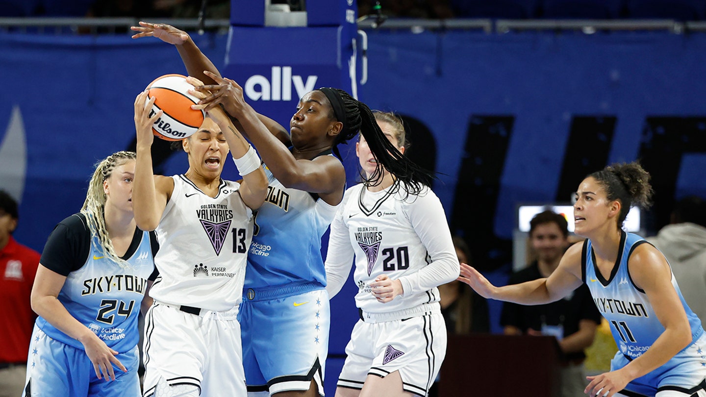 August 1, 2025; Chicago, Illinois: the center of the Sky Center Elizabeth Williams (1) defends himself against the striker of Golden State Valkyries, Janelle Salaun (13) during the first half at Wantrust Arena. (Images Kamil Krzaczynski / Imagn)