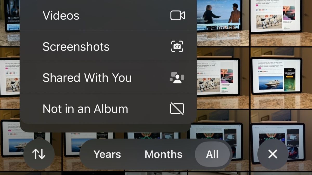 The iOS 18.4 update contains two new filtering options, “Shared With You” and “Not in An Album”, which are under the two arrow icons at the bottom left.