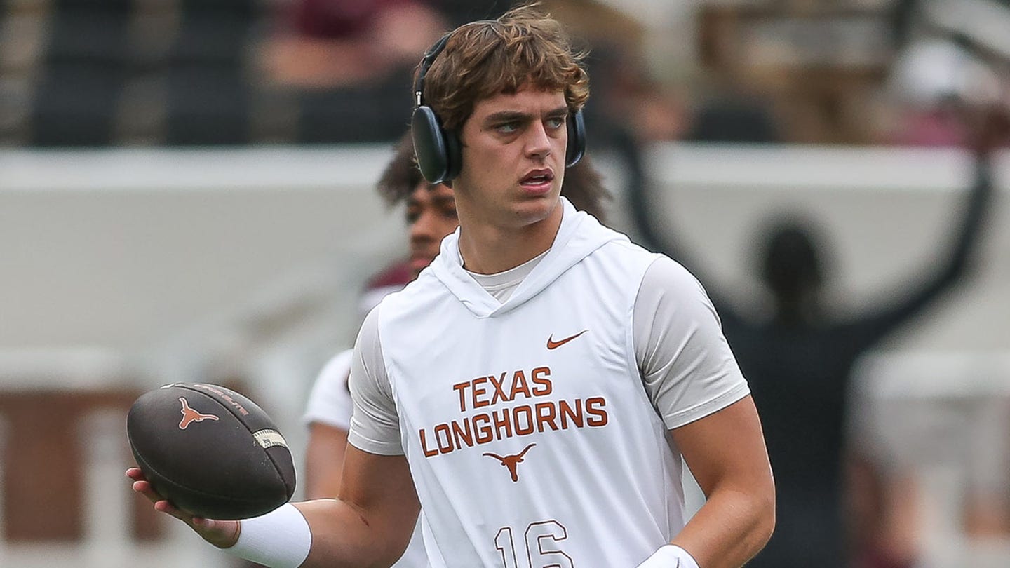 Texas quarterback Arch Manning (16) warms up before a Mississippi State NCAA college football game in Starkville, Miss., Saturday, Oct. 25, 2025. (AP Photo/James Pugh)