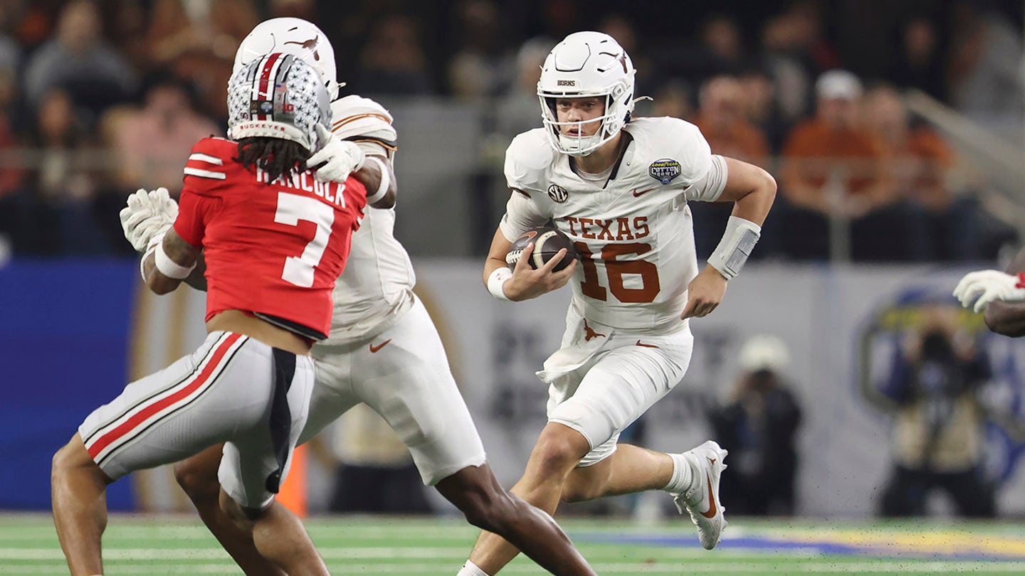Texas quarterback Arch Manning (16) throws against Ohio State during the first half of the Cotton Bowl College Football Playoff semifinal game Friday, Jan. 10, 2025, in Arlington, Texas. (AP Photo/Gareth Patterson)