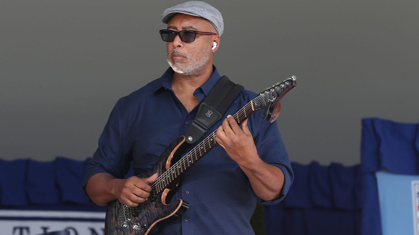 Former New York Yankees Bernie Williams playing the “Banner Spangled Star” on the guitar at the Howard J. Lamade stadium in Williamsport, Pennsylvania. (Al Tielemans / Sports Illustrated via Getty Images)