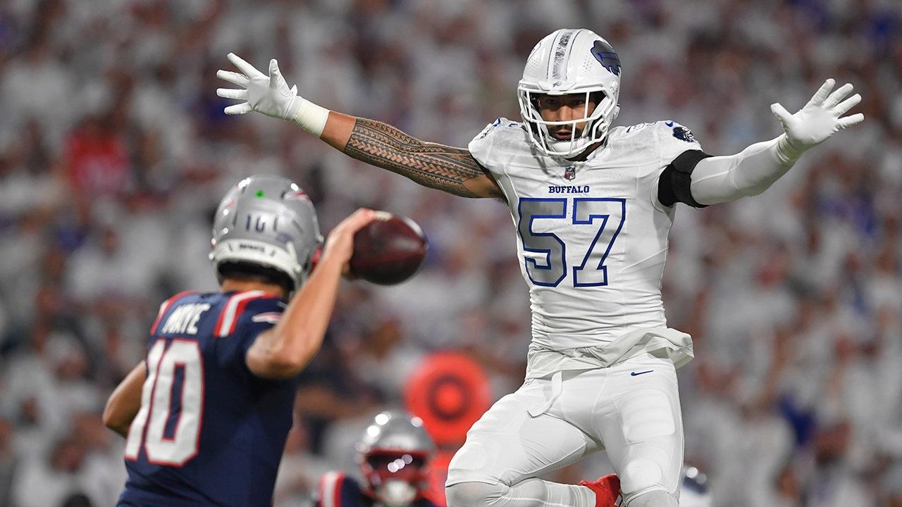 Buffalo Bills defensive end AJ Epenesa (57) pressures New England Patriots quarterback Drake Maye (10) during the first half of an NFL football game, Sunday, September 5, 2025, in Orchard Park, New York. (AP Photo/Adrian Kraus)