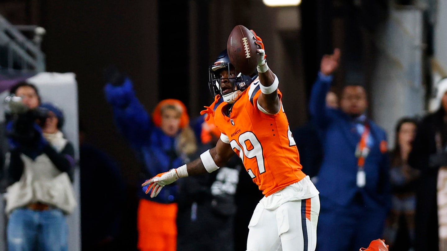 Ja’quan McMillian of the Broncos celebrates after intercepting a pass intended for Brandin Cooks of the Buffalo Bills during overtime at Empower Field At Mile High on January 17, 2026, in Denver. (Justin Edmonds/Getty Images)