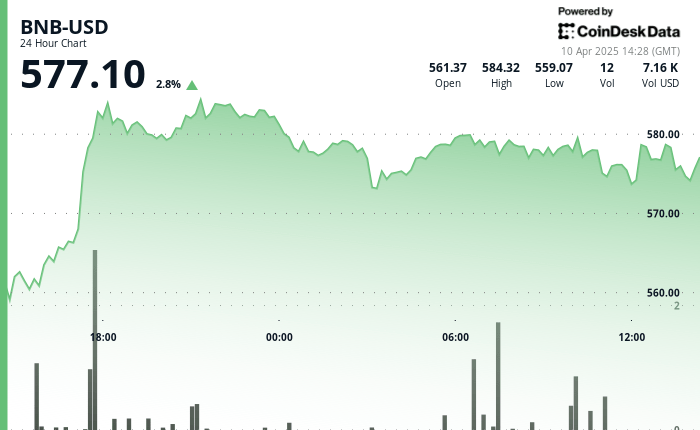 - In the last 100 minutes of negotiation, BNB decreased by 0.5% from $ 578.33 to $ 575.41.