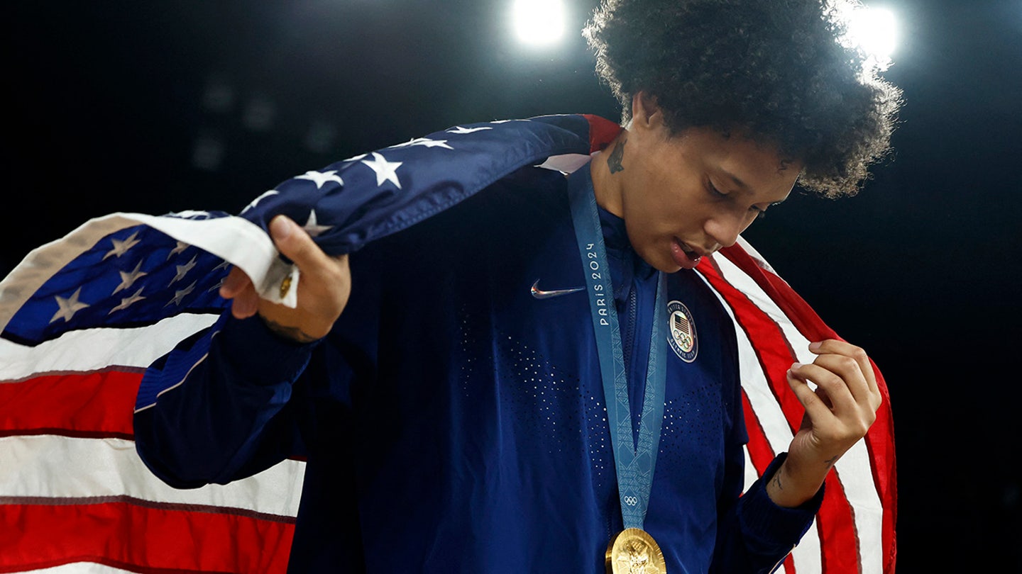 The United States’s Brittney Griner gold medalist holds the American flag. (Reuters / Evelyn Hockstein)