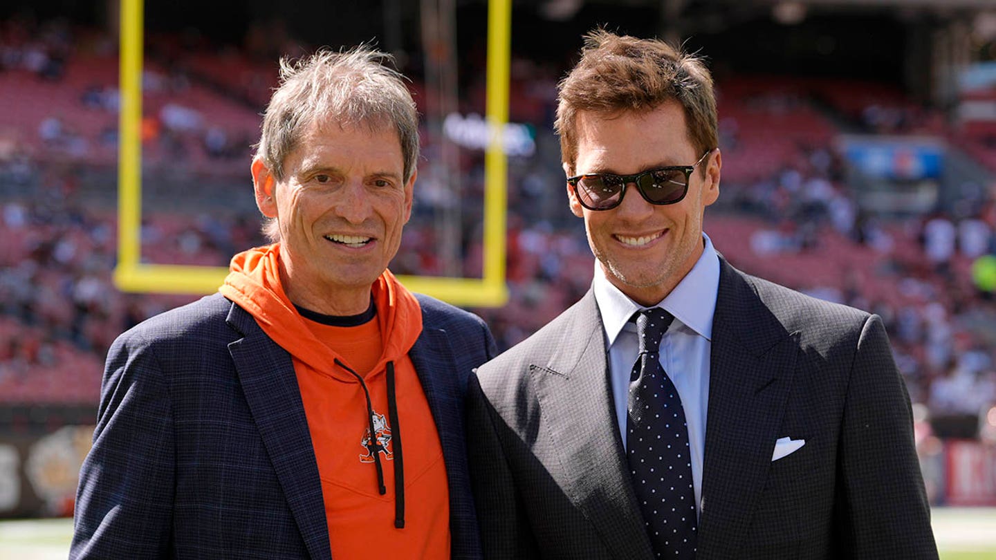 Former NFL players Bernie Kosar, left, and Tom Brady, right, pose for a photo as they talk on the field during warmups before a football game between the Dallas Cowboys and the Cleveland Browns in Cleveland, Sunday, Sept. 8, 2024. (AP Photo/Sue Ogrocki)