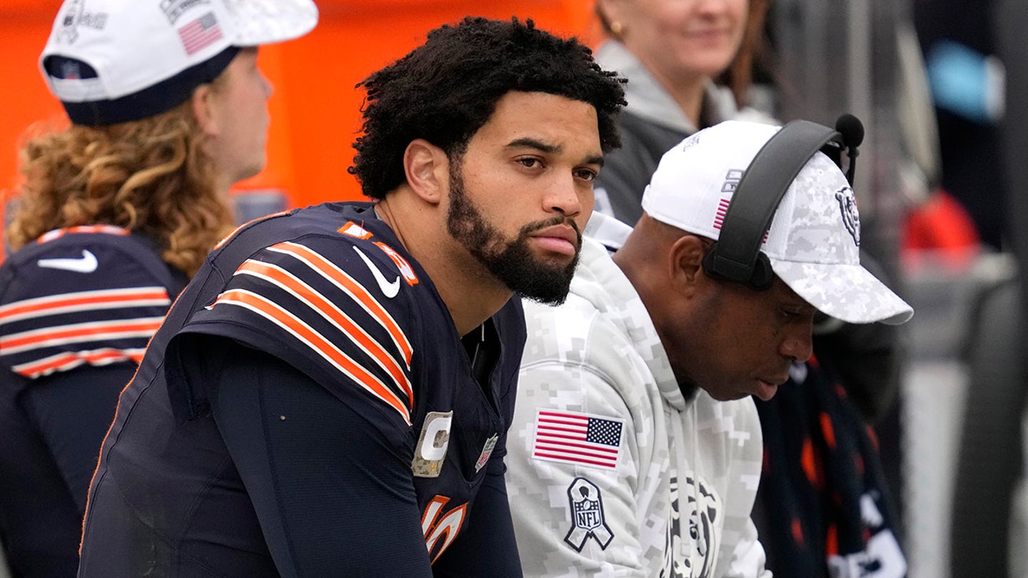 The quarter of Chicago Bears Caleb Williams is sitting on the bench in the last minutes of a match. (AP photo / Nam Y. Huh)