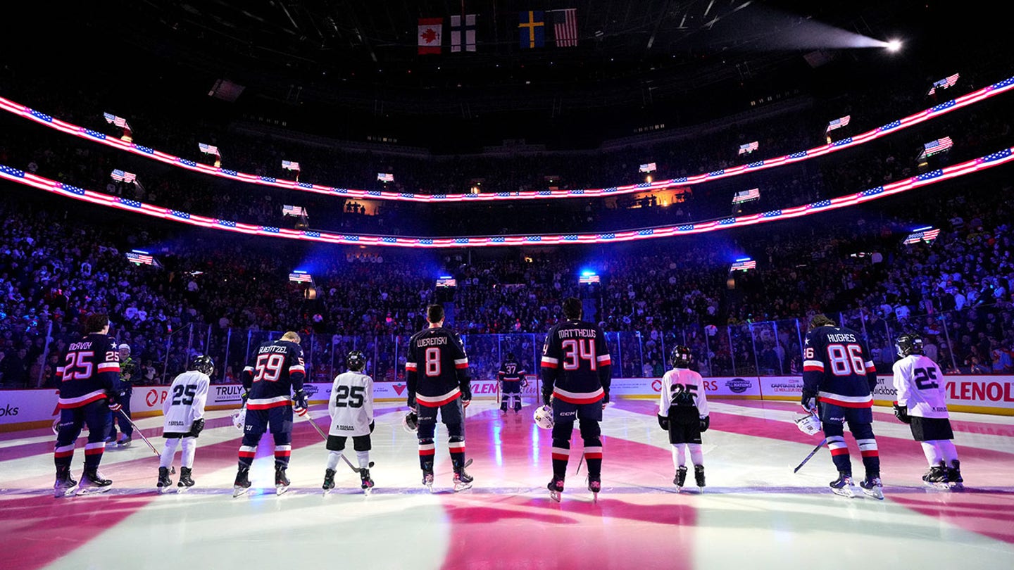 Charlie McAvoy (25), Jake Guentzel (59), Zach Werenski (8), Auston Matthews (34) and Jack Hughes (86) from the United States are held in their blue line during the pre-match ceremonies before a match of the game of 4 nations against the game against the 4 nations against the game against 4 nations against 4 nations against 4 nations against 4 nations against the 4 nations against 4 nations against 4 nations against 4 nations against 4 nations against 4 nations against 4 nations against 4 nations against 4 nations against 4 nations against 4 nations against 4 nations against 4 nations against 4 nations against 4 nations against 4 nations against 4 nations against 4 nations against 4 nations against 4 nations against 4 nations against 4 nations Against 4 nations against 4 nations against 4 nations against 4 nations against 4 nations against 4 nations against 4 nations against 4 nations against 4 nations against 4 nations against 4 nations against 4 nations against 4 nations against 4 Nations against 4 nations. Finland at the Bell Center on February 13, 2025 in Montreal. (Andre Ringuette / 4nfo / World Hockey Cup via Getty Images)