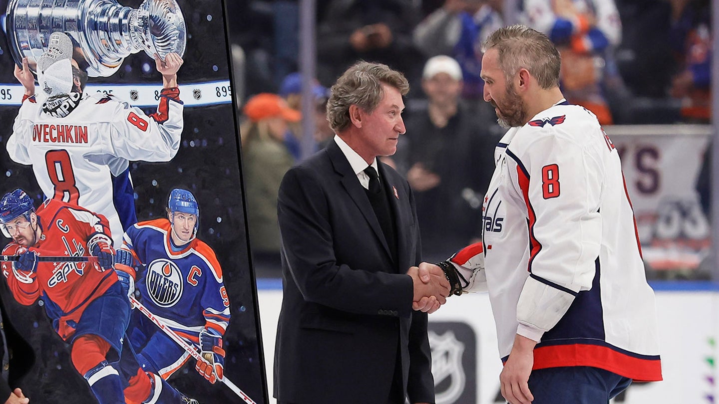 The Washington Capitals’ left averse, Alex Ovechkin (8) was greeted by Wayne Gretzky during a ceremony after scoring her 895th career goal during the second period of a NHL hockey match against the New York Icelanders in Elmont, NY, Sunday, April 6, 2025. (AP photo / Adam Hunger)