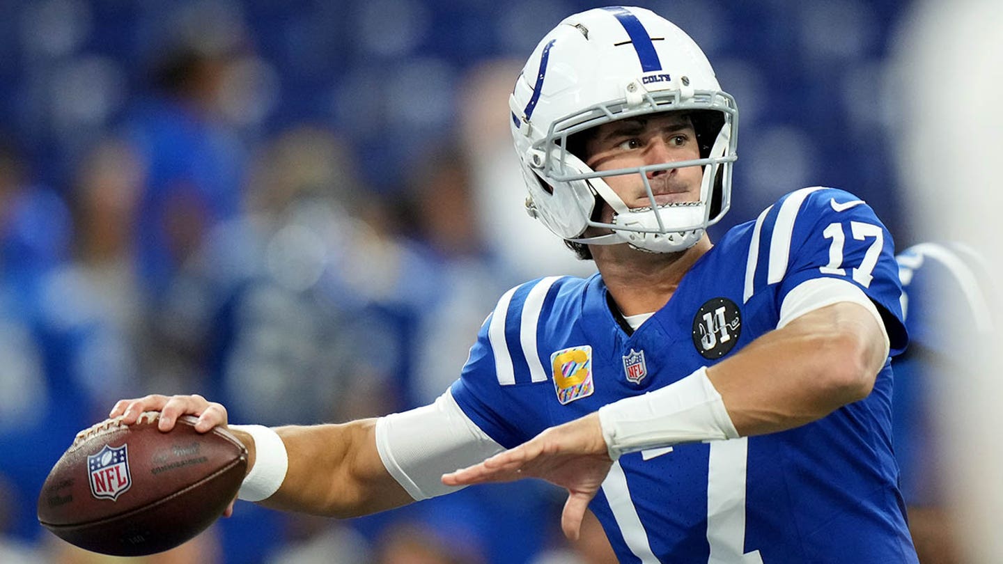 Indianapolis Colts quarterback Daniel Jones throws before an NFL football game against the Las Vegas Raiders in Indianapolis, Indiana on October 5, 2025. (AJ Mast/AP Photo)