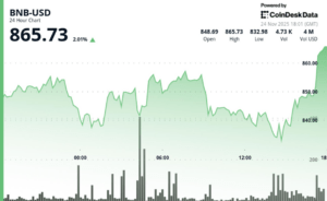 The rally has carried BNB above several resistance areas, but the relatively low volume behind this move could limit follow-through as traders monitor the $870 level.