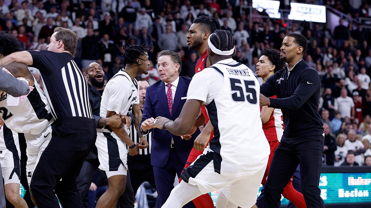 Providence forward Duncan Powell sparked a commotion with a hard foul on St. John’s Bryce Hopkins. Powell stood over him after the foul, and Hopkins got up and charged at Powell, starting the chaos.