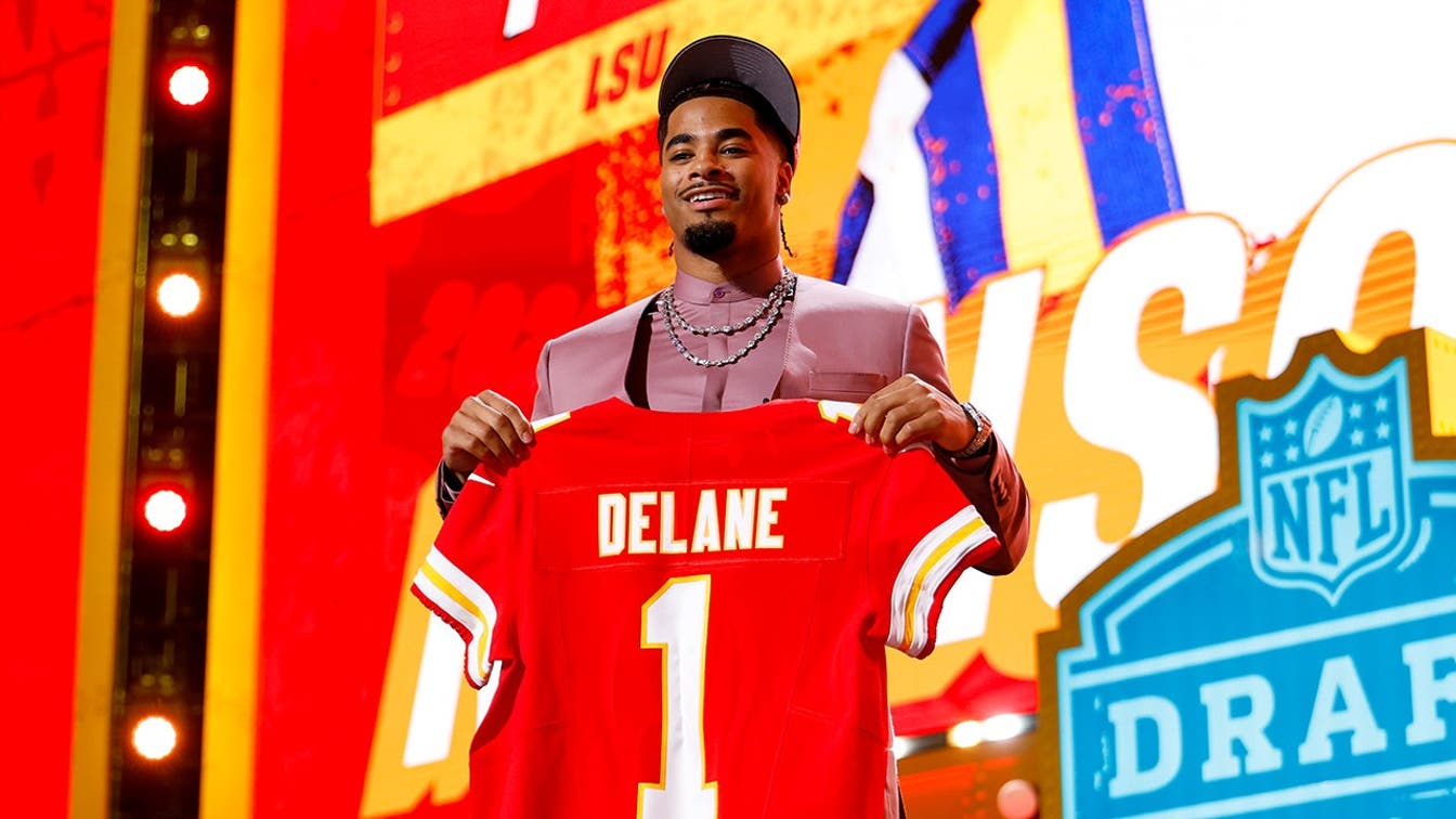 LSU’s Mansoor Delane poses for a photo after being selected sixth overall by the Kansas City Chiefs in the first round of the 2026 NFL Draft at Acrisure Stadium in Pittsburgh, Pennsylvania on April 23, 2026. (Lauren Leigh Bacho/Getty Images)