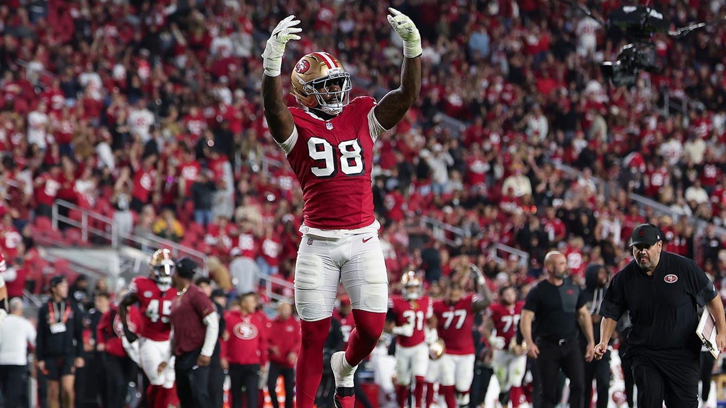 San Francisco 49ers defensive end Mykel Williams (98) celebrates during the first half of an NFL football game against the Atlanta Falcons, Sunday, October 19, 2025, in Santa Clara, California. (AP Photo/Kelley L Cox)