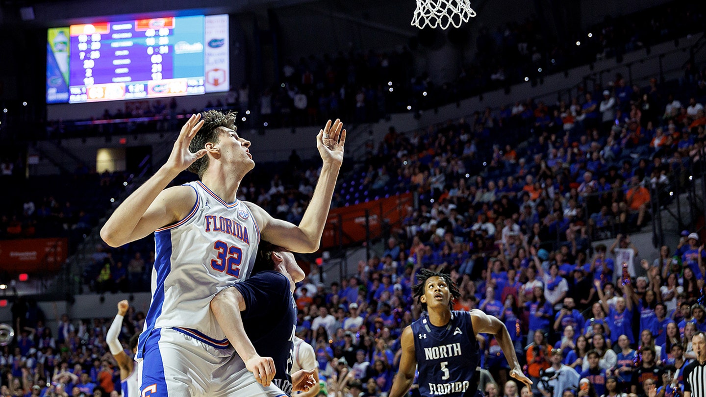 North Florida guard Trey Cady, right forward, defends against Florida center Olivier Rioux (32) during the second half of an NCAA college basketball game in Gainesville, Fla., Nov. 6, 2025. (Photo Chris Watkins/AP)