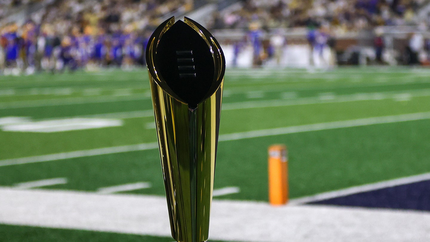 A view of the College Football Playoff National Championship trophy on the sidelines of a game between the Georgia Tech Yellow Jackets and the Pittsburgh Panthers in the fourth quarter at Bobby Dodd Stadium at Hyundai Field on November 22, 2025 in Atlanta, Georgia. (Brett Davis/Imagn Images)
