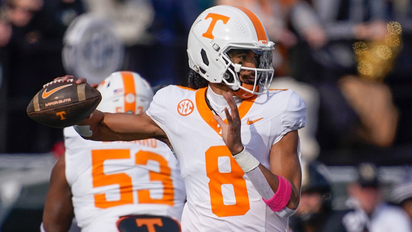 The quarter of Tennessee Nico Iamaleava (8) launched the ball during the first quarter at the Firstbank stadium in Nashville, tenn., Saturday November 30, 2024. (Imagn)
