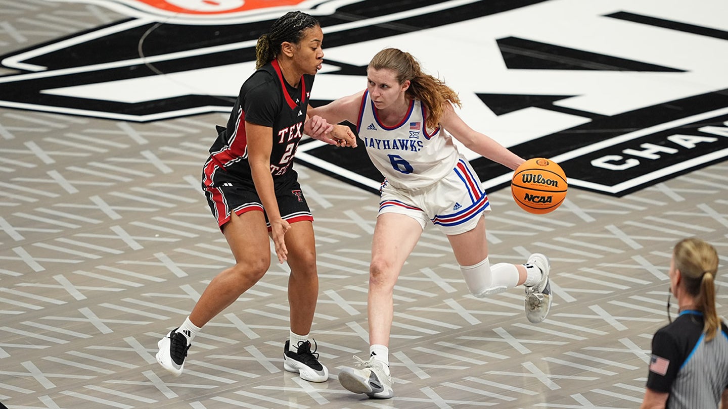 Laia Conesa (6) of the Kansas Jayhawks tries to dribble the ball after Loghan Johnson (23) of the Tech Red Raiders Tech Red Raiders in the third round of the Big 12 female tournament at T-Mobile Center on March 5, 2025, in Kansas City, Mo. (Images Kyle Rivas / Getty)