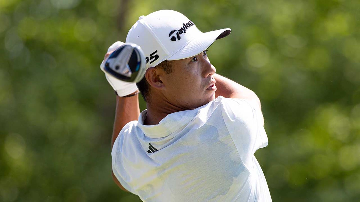 Collin Morikawa played his shot from the first tee in the second round of the Travelers championship on June 20, 2025. (Images Bill Streicher-Imagn)