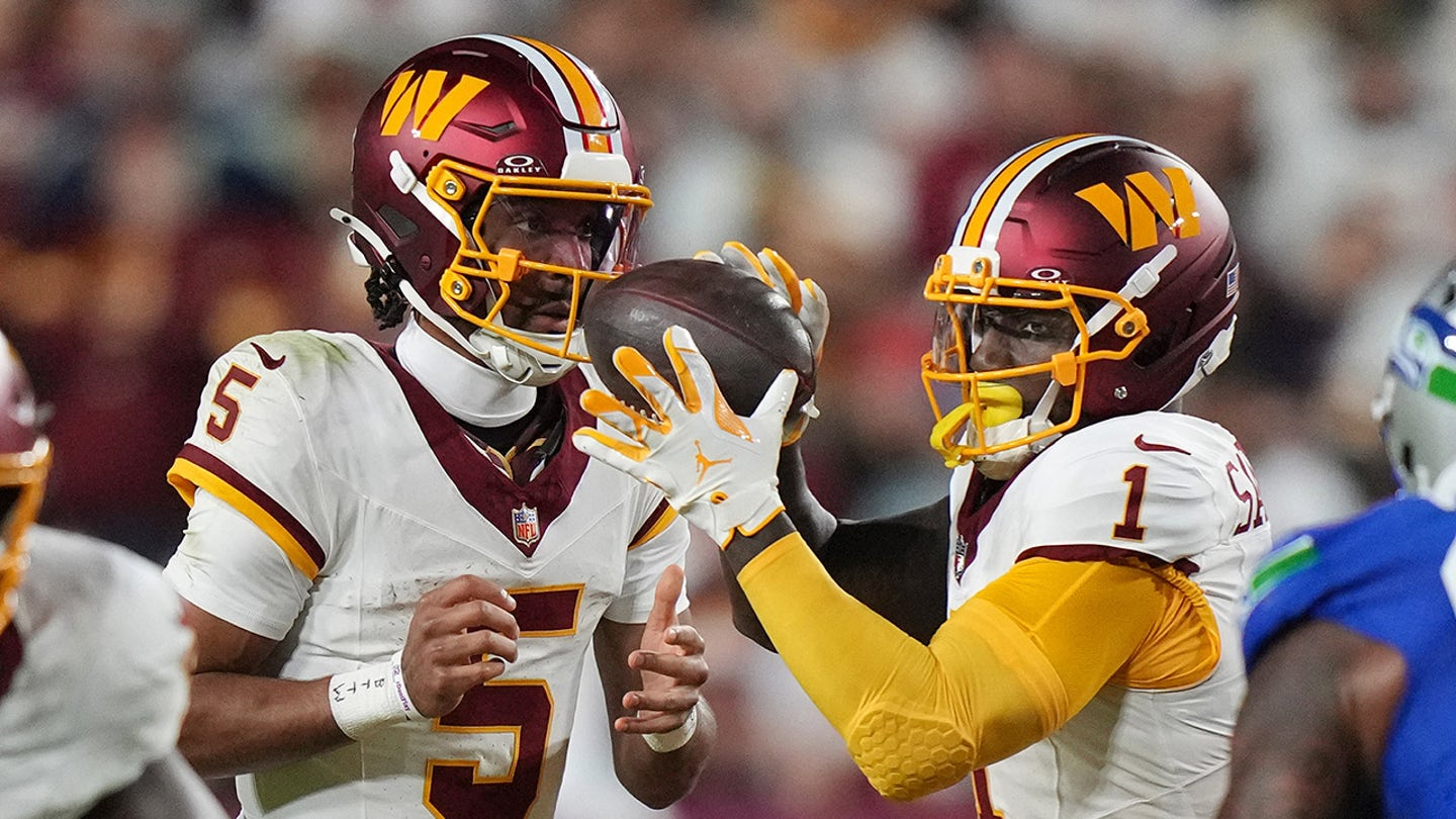 Washington Commanders wide receiver Deebo Samuel (1) is thrown the ball by Washington Commanders quarterback Jayden Daniels (5) during the first half of an NFL football game against the Seattle Seahawks, Sunday, Nov. 2, 2025, in Landover, Maryland. (AP Photo/Stéphanie Scarbrough)