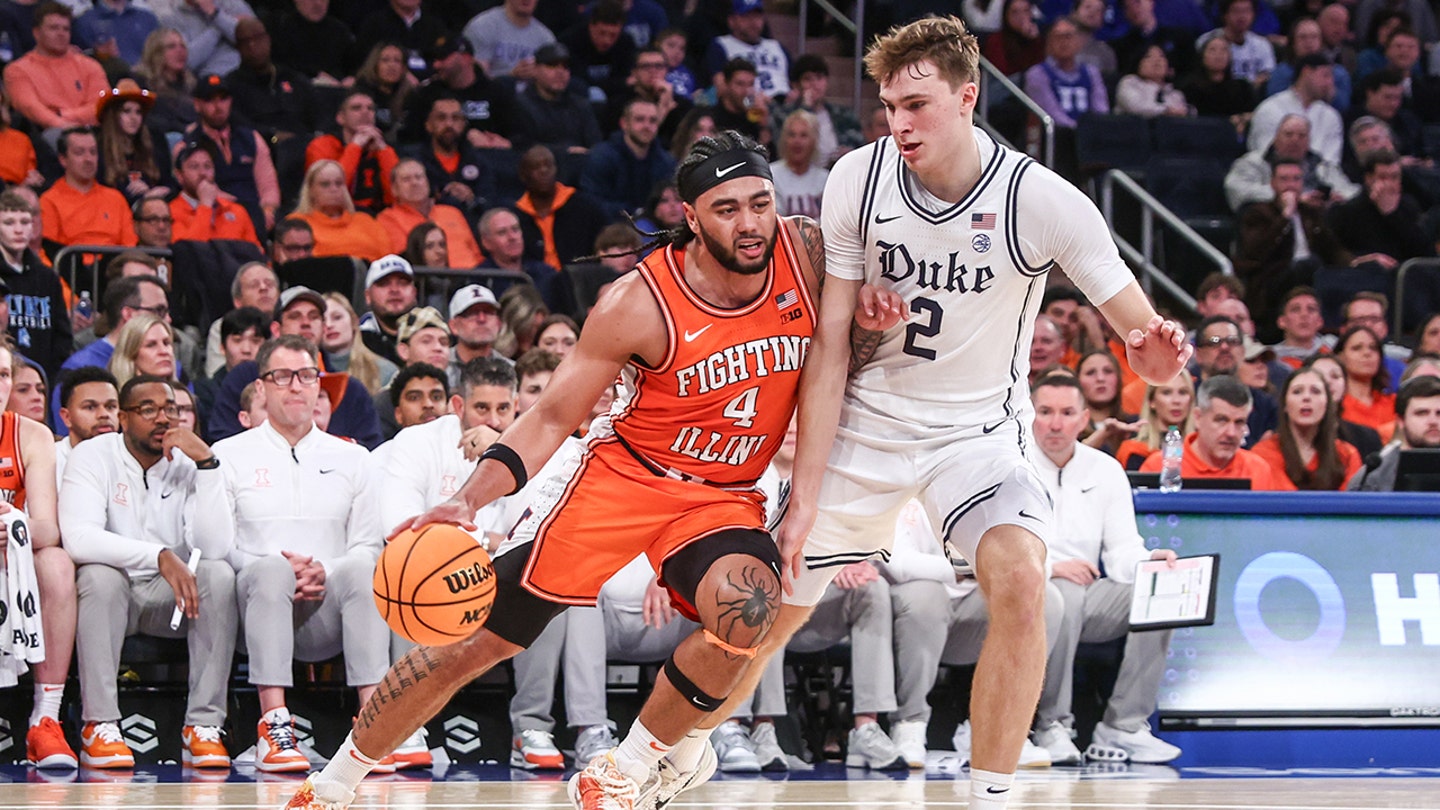 Kylan Boswell (4) from Illinois passes in front of Cooper Flagg from Duke. (Wendell Cruz-Imagn images)