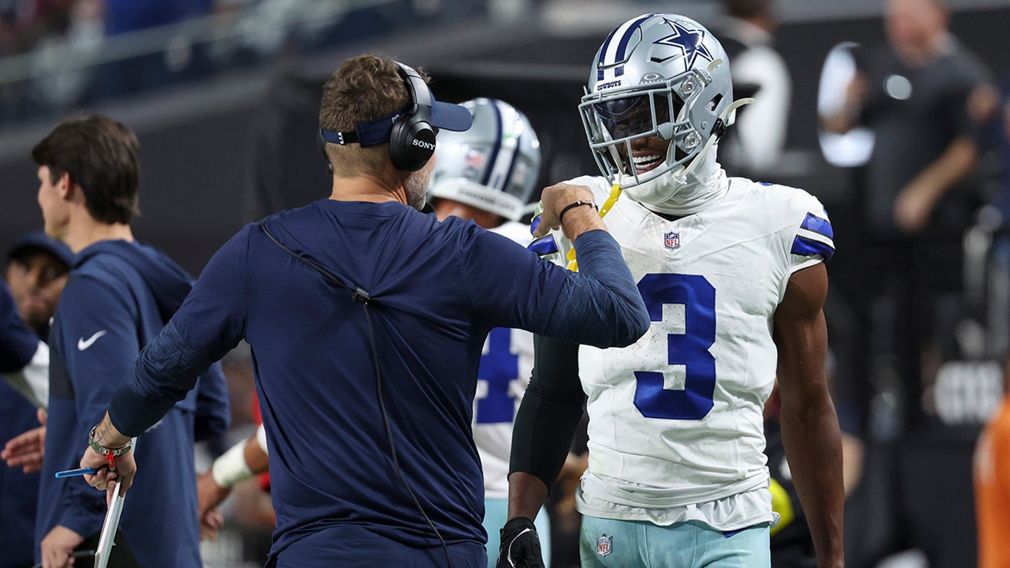Dallas Cowboys head coach Brian Schottenheimer and wide receiver George Pickens (3) celebrate after their team’s touchdown against the Las Vegas Raiders in the third quarter of a game at Allegiant Stadium on November 17, 2025 in Las Vegas, Nevada. (Ian Maule/Getty Images)