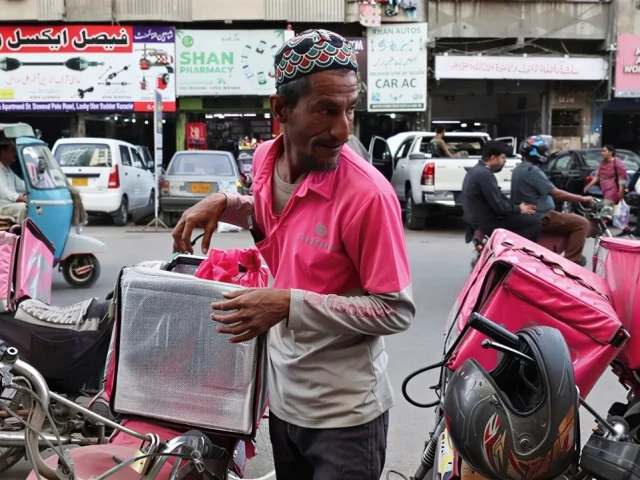 A Foodpanda delivery driver loads items into his delivery box before delivering them in Karachi, Pakistan, March 13, 2026. PHOTO: Reuters