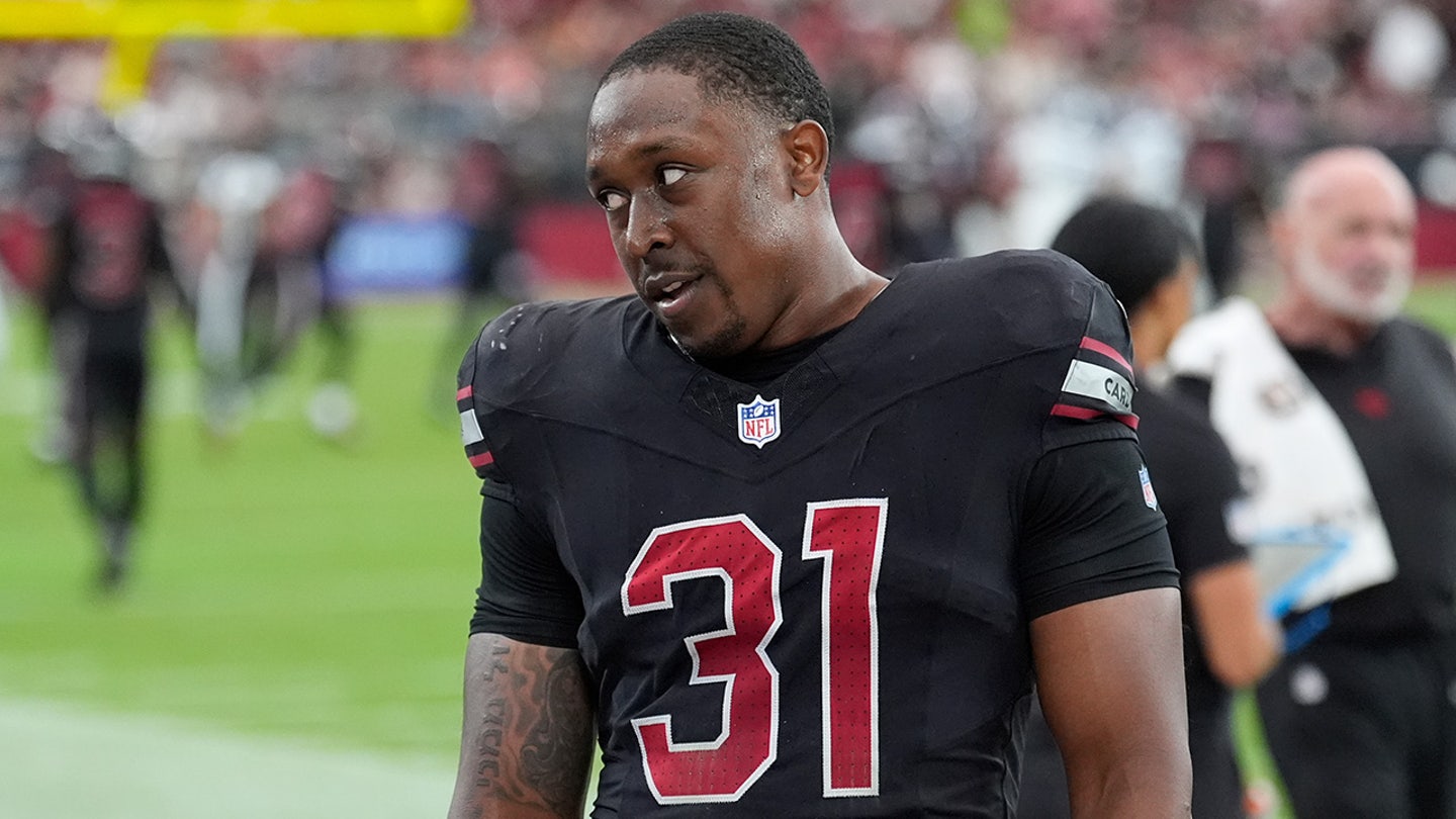 Arizona Cardinals running back Emari Demercado (31) reacts on the sideline after fumbling the ball out of the end zone on a touchdown during the second half of an NFL football game against the Tennessee Titans, Sunday, Oct. 5, 2025, in Glendale, Arizona. (AP Photo/Ross D. Franklin)