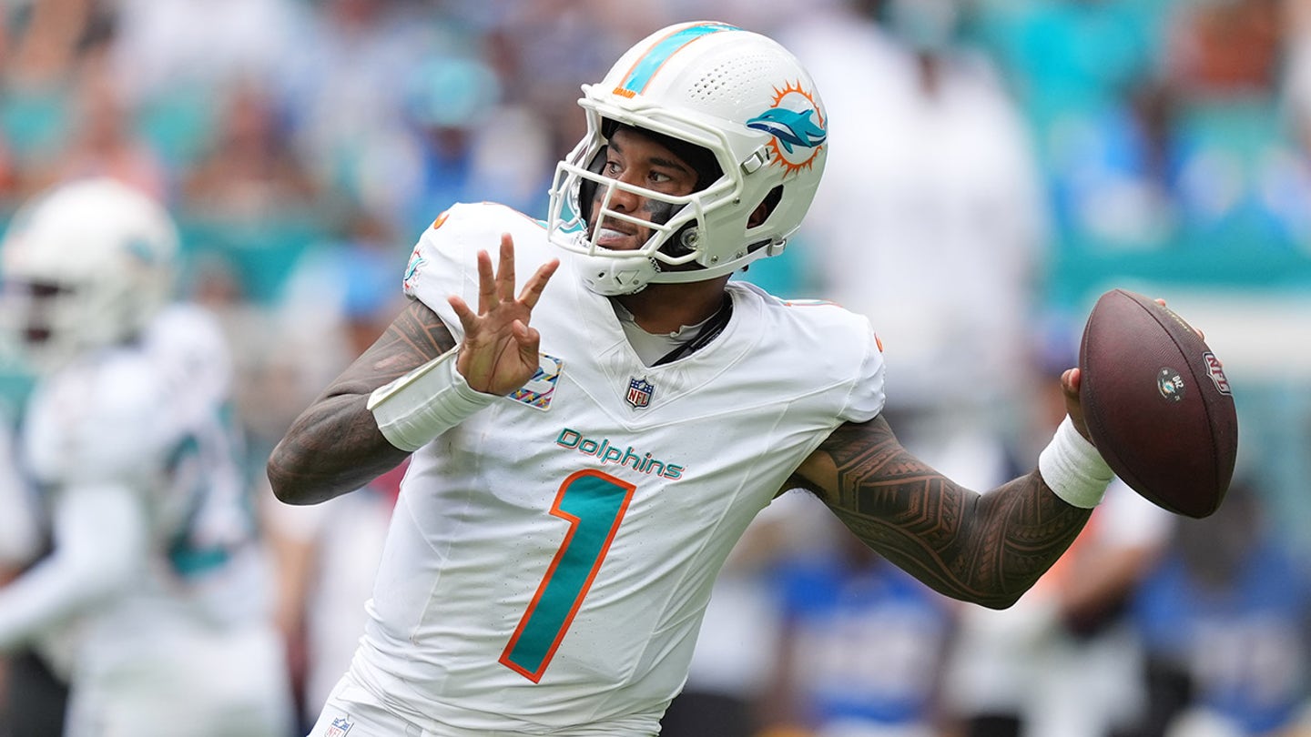 Miami Dolphins quarterback Tua Tagovailoa throws a pass during the first half of an NFL football game against the Los Angeles Chargers, Sunday, Oct. 12, 2025, in Miami Gardens, Florida. (AP Photo/Rebecca Blackwell)