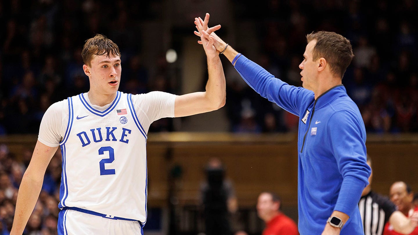 Duke Cooper Flagg High-Fives, Jon Scheyer’s head coach during the North Carolina State match in Durham on January 27, 2025. (AP photo / ben mckeown)