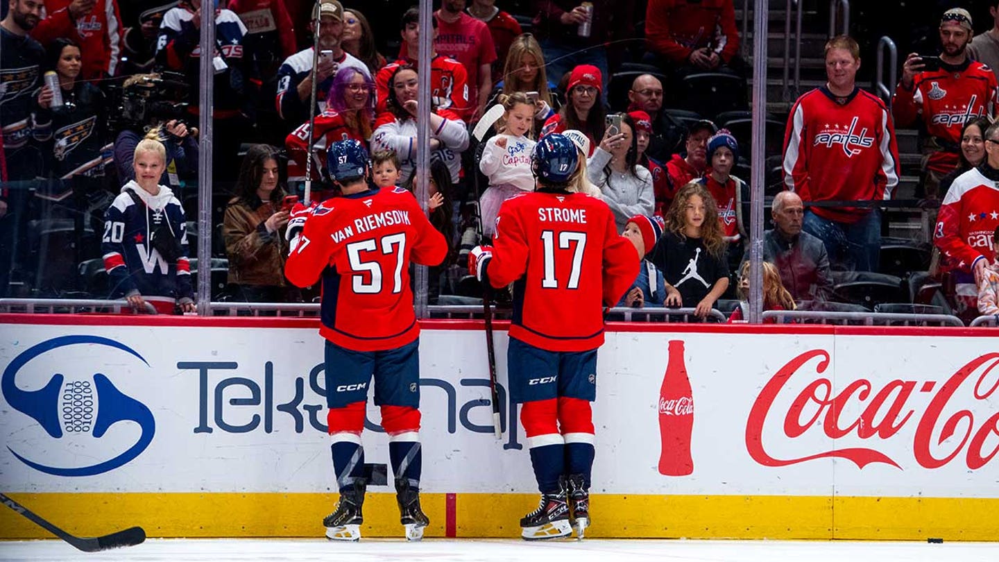 Trevor van Riemsdyk (57) of the Washington Capitals and Dylan Strome (17) of the Washington Capitals greet their wives and children during warmups at Capital One Arena in Washington, District of Columbia, March 1, 2025. (Sophia Price/NHLI via Getty Images)