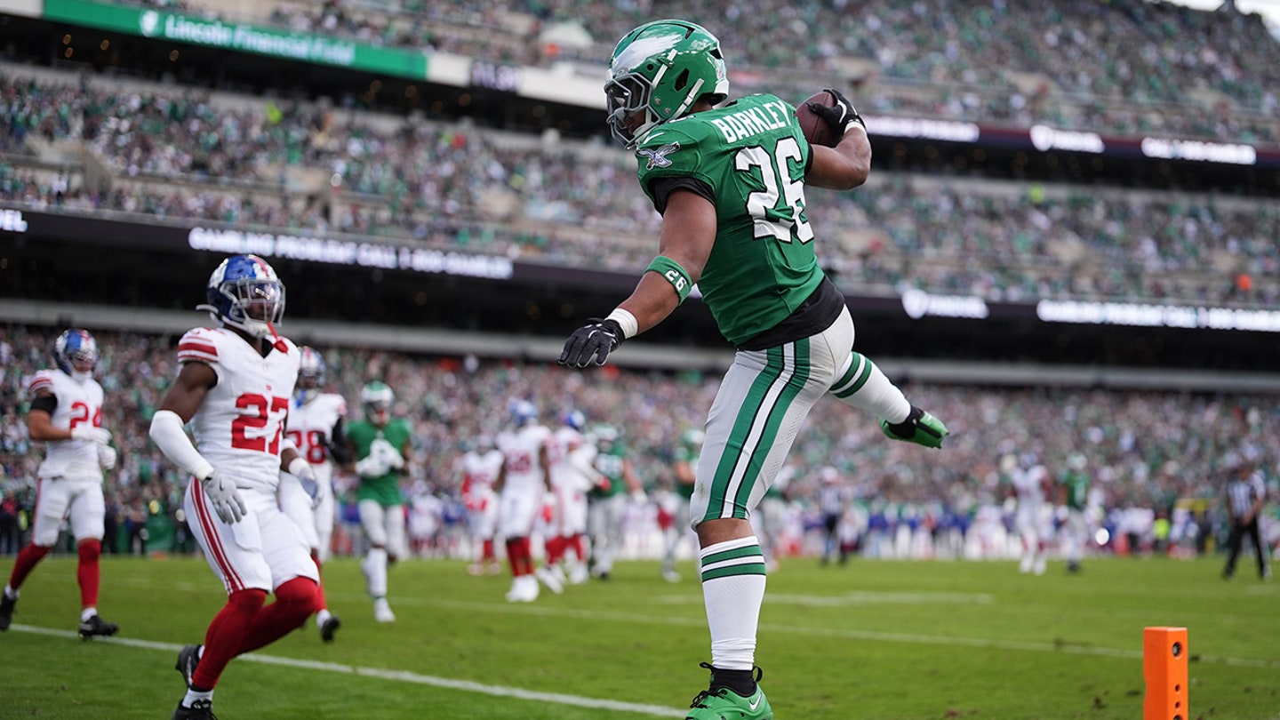 Philadelphia Eagles running back Saquon Barkley scores a touchdown during the first half of an NFL football game against the New York Giants, Sunday, Oct. 26, 2025, in Philadelphia. (AP Photo/Matt Slocum)