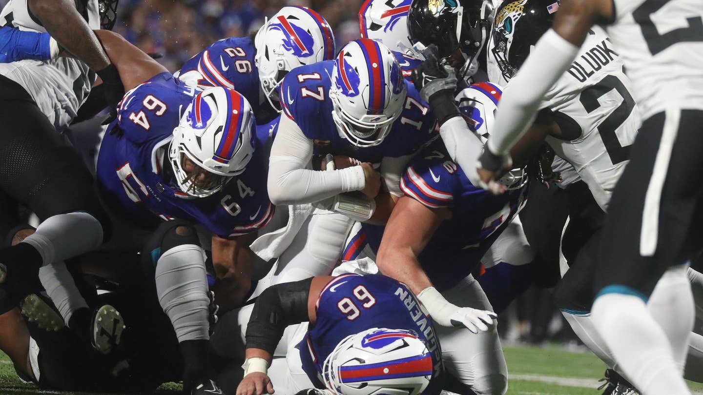 Bills quarterback Josh Allen gets the 1-yarder for a first down on the push play during the first half at Highmark Stadium in Orchard Park on September 23, 2024.