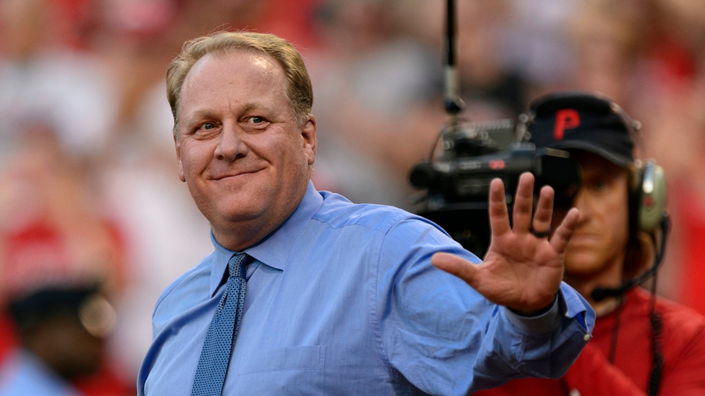 The enthronement at Philadelphia Phillies Wall of Fame Curt Schilling is introduced before the Phillies playing the Braves of Atlanta at the Citizens Bank Park in Philadelphia on August 2, 2013. (Howard Smith-USA today Sports)