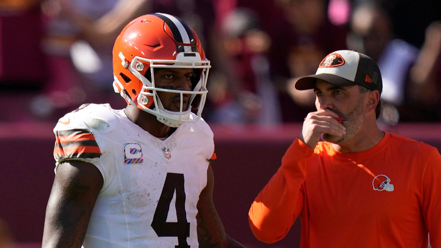 Cleveland Browns head coach Kevin Stefanski, on the right, talks with the quarter-Arrière Deshaun Watson (4) during the second half against Washington Commanders in Landover, MD., October 6, 2024. (AP photo / Stephanie Scarbrough)