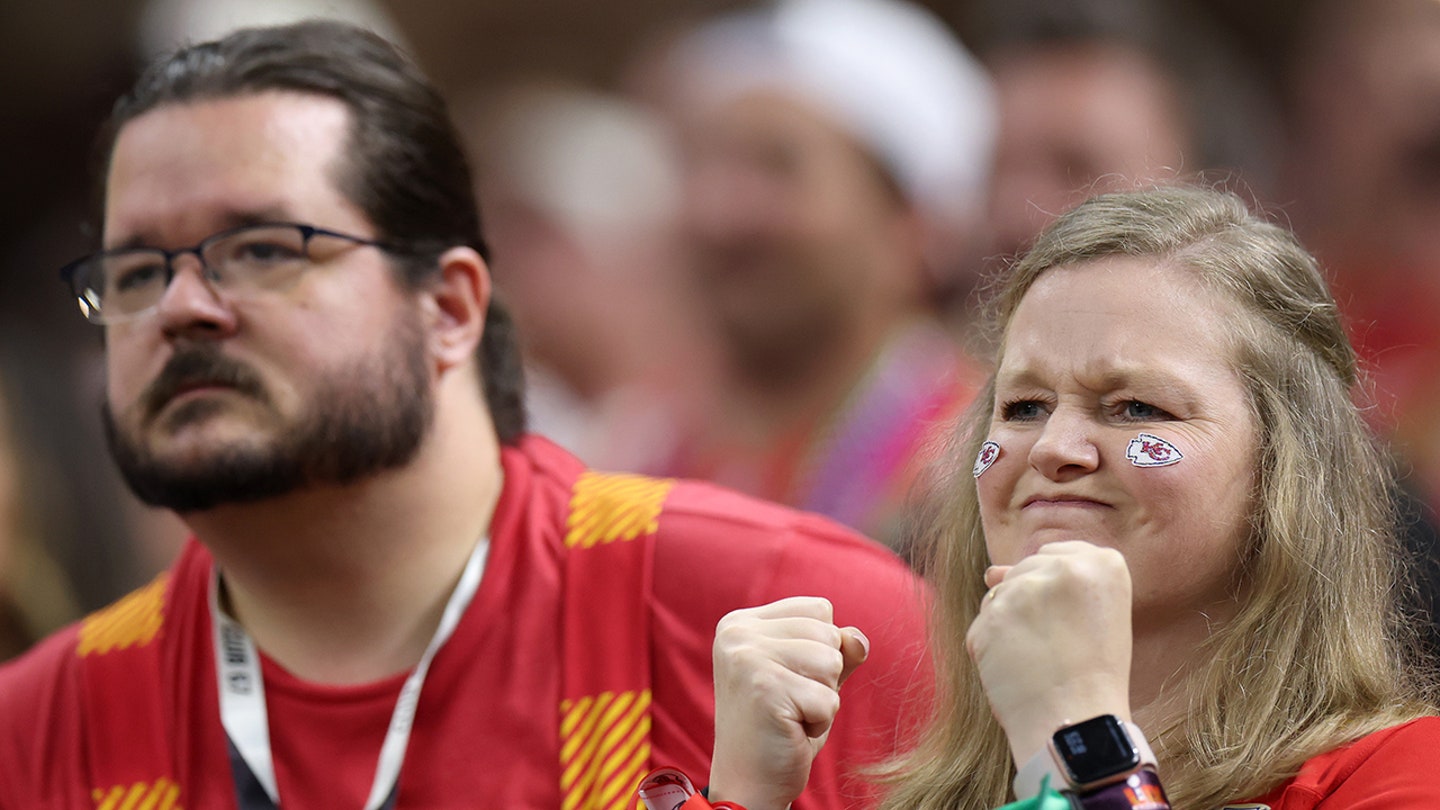 A fan of Kansas City chiefs reacts in the third quarter against the Philadelphia Eagles during the Super Bowl Lix in Caesars Superdome on February 09, 2025 in New Orleans, Louisiana. (Images Jamie Squire / Getty)
