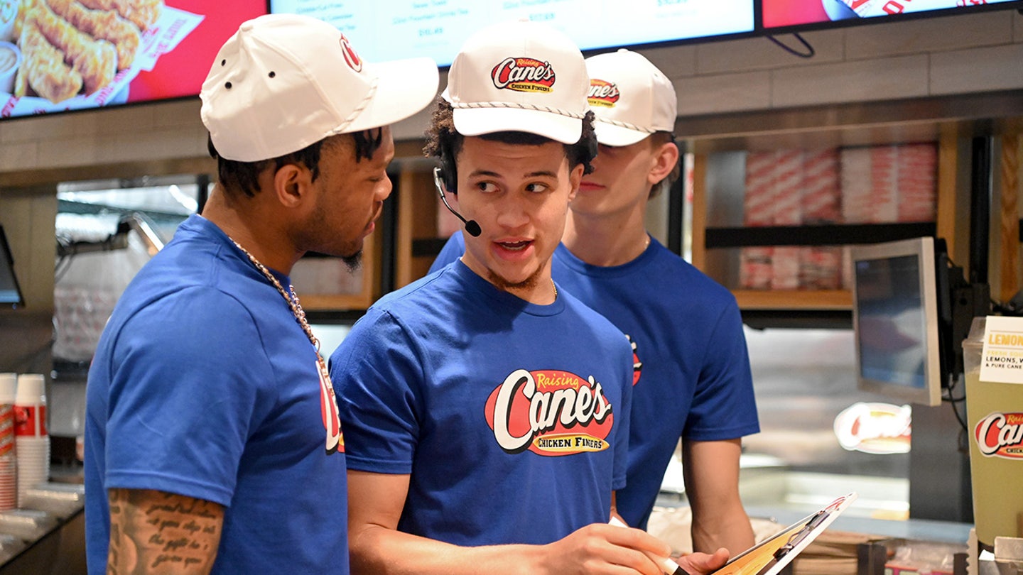 Alijah Martin, Walter Clayton Jr. and Thomas Haugh work a festive “quarter of work” to raise on April 10, 2025 from Cane in Gainesville, Florida. (Gerardo Mora / Getty Images to raise canes)