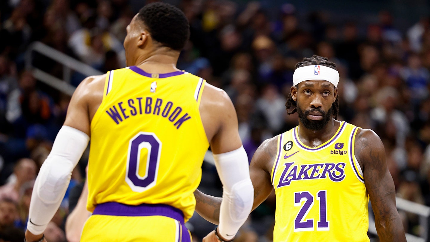 Russell Westbrook #0 and Patrick Beverley #21 of the Los Angeles Lakers interact against the Orlando Magic during the second quarter at Amway Center on December 27, 2022, in Orlando, Florida. (Douglas P. DeFelice/Getty Images)