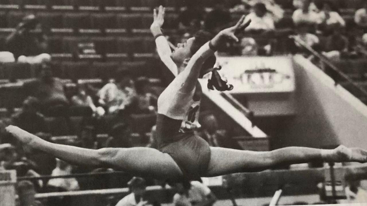 Jennifer Sey, 1986 U.S. national all-around gymnastics champion, performs a high jump during a competition. (XX-XY Athletics/Jennifer Sey)