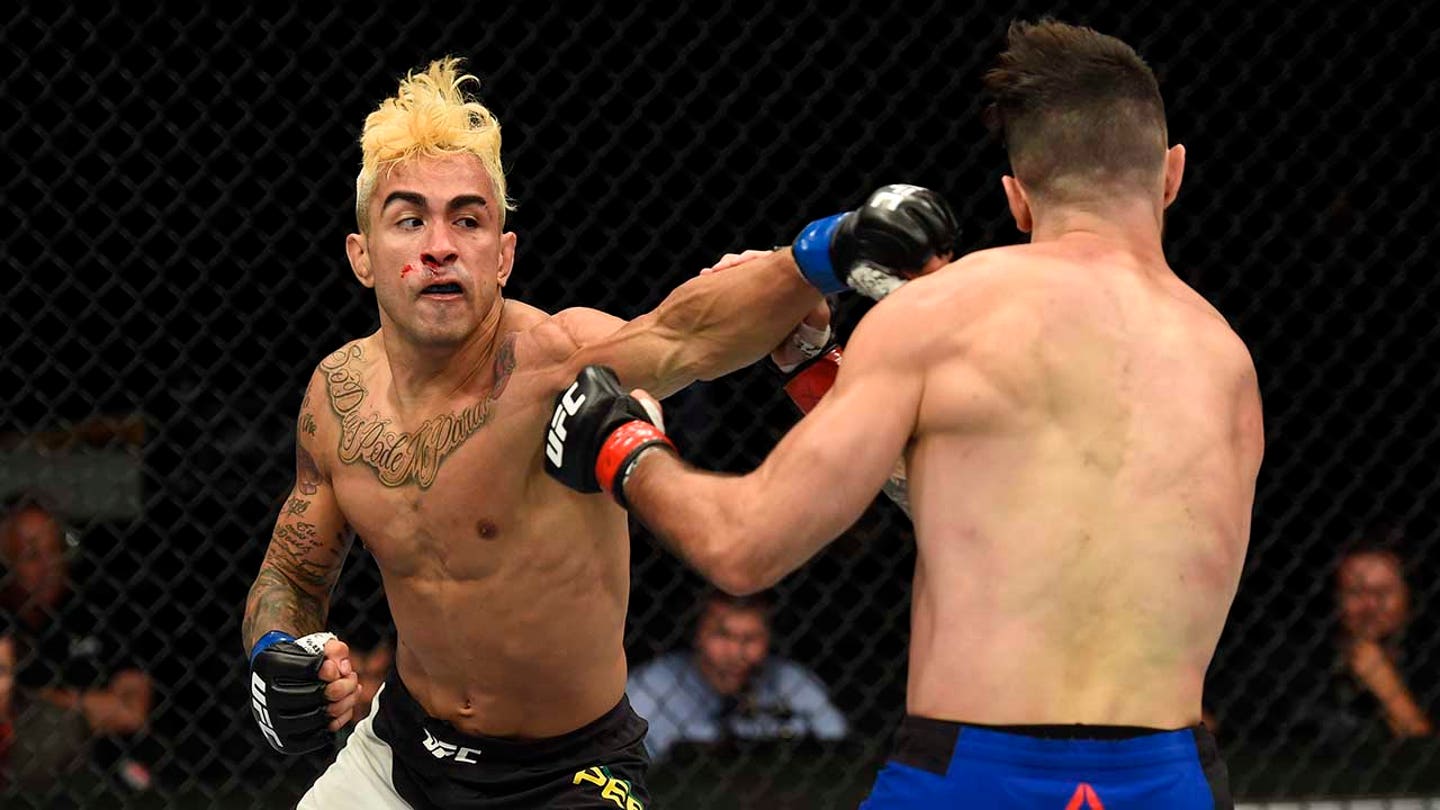 (L-R) Brazil’s Godofredo Pepey punches Shane Burgos during their featherweight bout at UFC Fight Night at Nassau Veterans Memorial Coliseum in Uniondale, New York on July 22, 2017. (Josh Hedges/Zuffa LLC/Zuffa LLC via Getty Images)