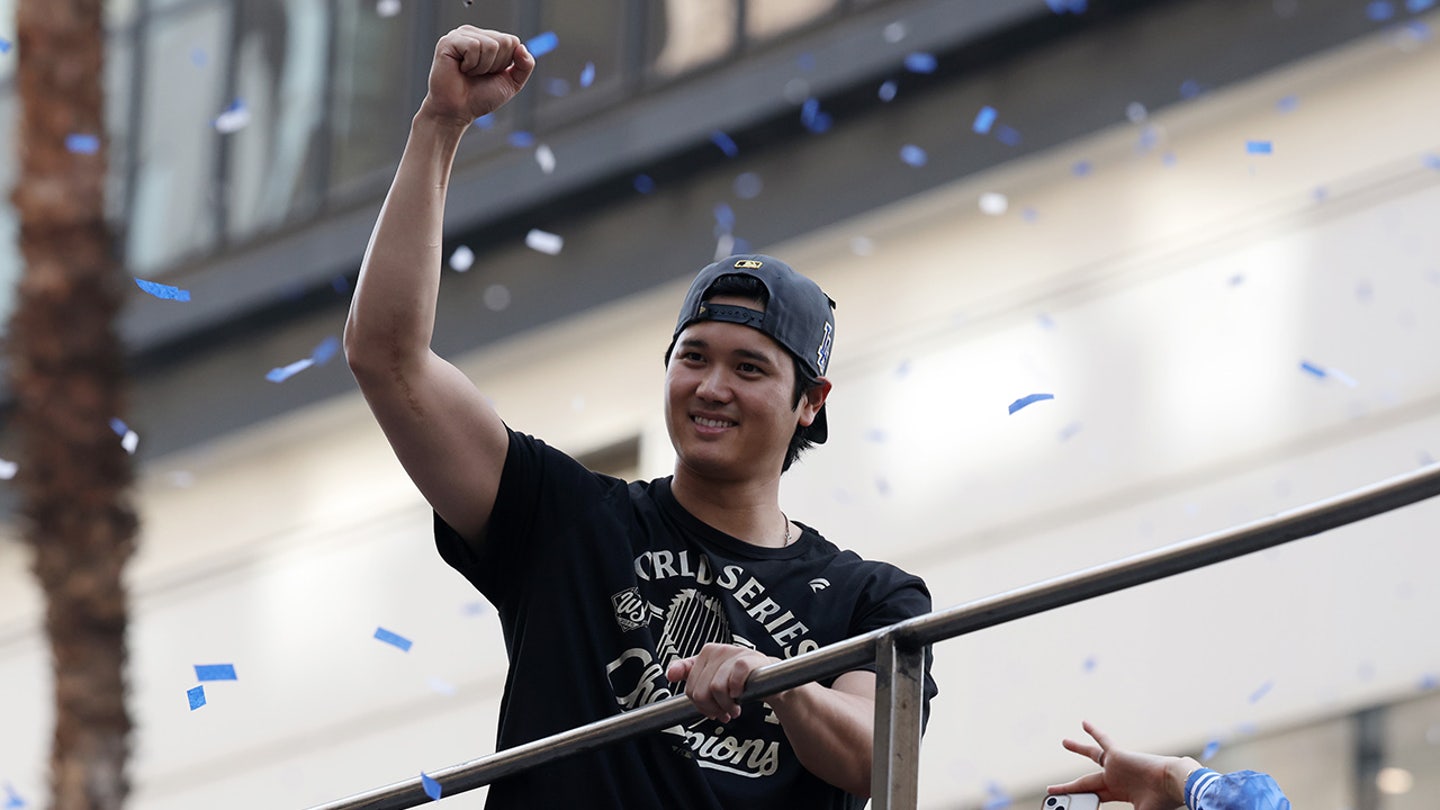 Los Angeles Dodgers two-way player Shohei Ohtani waves to the crowd during the World Series Championship Parade in Downtown Los Angeles on November 3, 2025 in Los Angeles, California. (Kiyoshi Mio/Imagn Images)