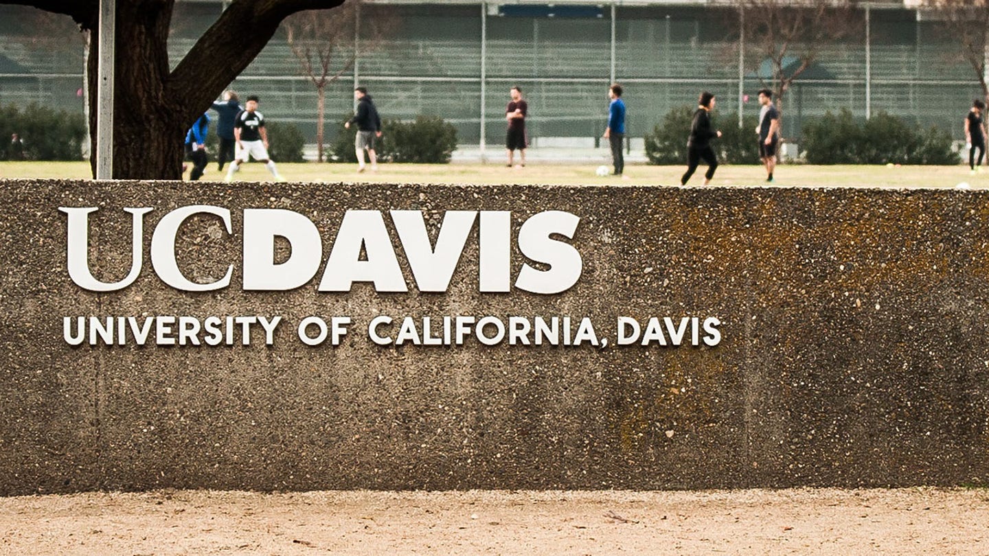 The UC Davis logo with a football match and cyclists in the background. University of California in Davis. Davis, California. Taken on February 2, 2015. (Getty Images)