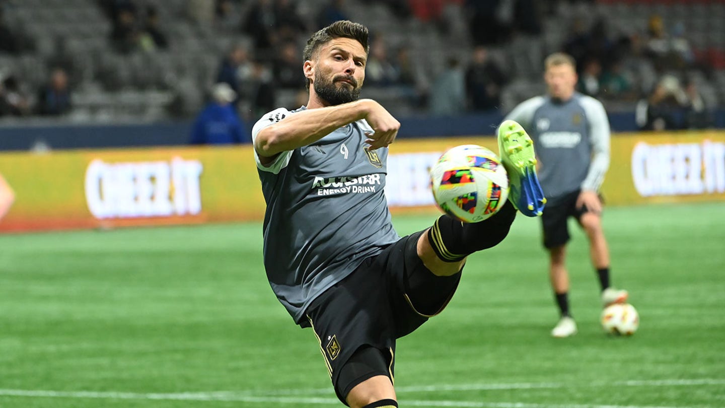 Lafc striker Olivier Giroud (9) warms before the match against the Whitecaps in Vancouver in a match of the 2024 MLS cup playoffs in British Columbia. (Simon Fearn-Imagn images)